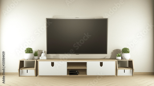 Obraz premium Tv on wooden cabinet in modern empty room and white wall on white floor room japanese style. 3d rendering