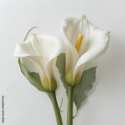 Obraz premium Twee witte calla aronskelk bloemen tegen een witte achtergrond