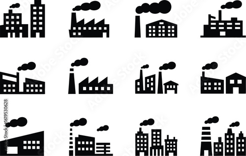 © Munawar, Obraz premium Twelve black factory icons with smoke stacks in a grid on a white background