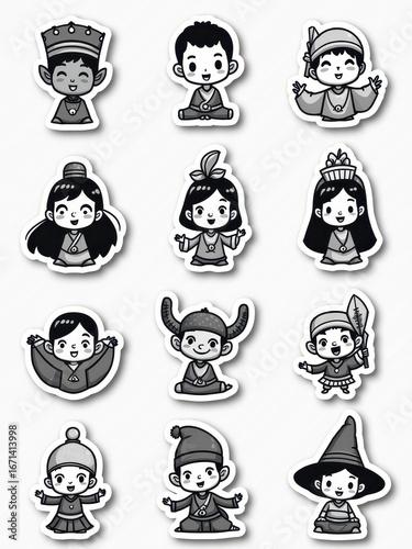 © adobe, Naklejka premium Twelve charming, stylized characters in grayscale, each wearing distinctive attire and accessories, conveying a sense of playful wonder and cultural diversity.