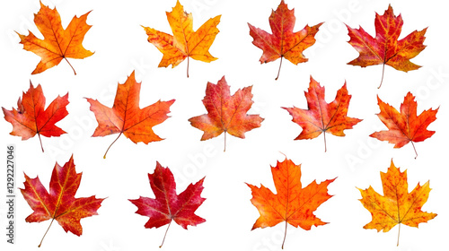 Fototapeta premium Twelve colorful maple leaves falling gently on a transparent background, perfect for autumn-themed designs