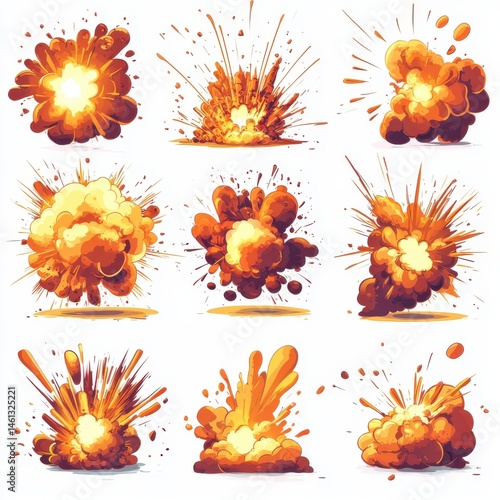 © Yothin, Obraz premium Twelve Pixel Art Explosion Animations Fiery Orange and Yellow Bursts on White