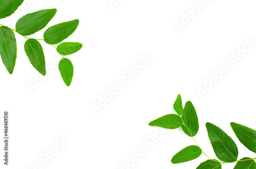 Fototapeta premium Twigs with green leaves on a white background. Natural background with place for text