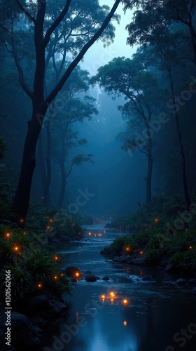 Fototapeta premium Twilight Amazon Rainforest Landscape: Enchanted River, Fireflies, Misty...