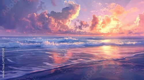 © ArtificialHorizons, Fototapeta premium Twilight beach waves in the sky
