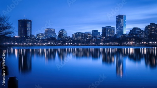 © MUHAMADFADZLAN, Naklejka premium Twilight City Skyline Reflected in Water
