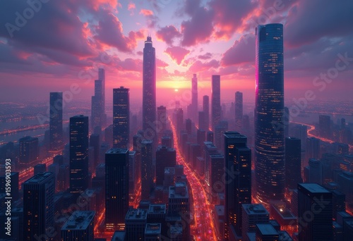 Fototapeta premium twilight city skyline vibrant colorful lights urban nightscape illuminated...