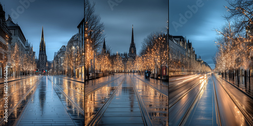 © Artistry, Obraz premium twilight city street triptych with glowing string lights, wet pavement reflections and church steeple in serene festive composition