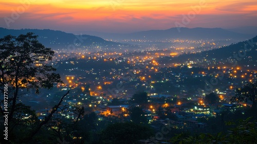 © Achmad, Obraz premium Twilight Cityscape: Hillside Panorama of Illuminated Town at Dusk