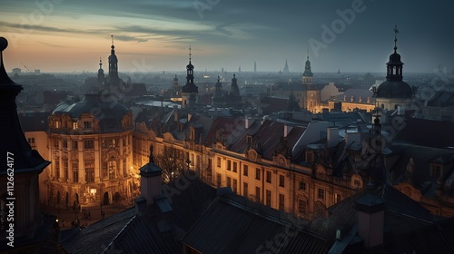 © Ardhana, Fototapeta premium Twilight cityscape showcasing old European architecture and skyline