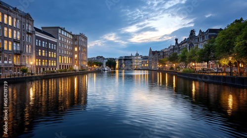 Fototapeta premium Twilight Cityscape with Canal Reflections and Gentle Lighting
