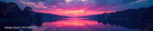 Fototapeta premium Twilight colors in calm river with trees along the shore, peaceful, water,...