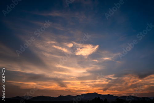 Obraz premium Twilight dramatic blue sky with white clouds and orange sunlight and silhouette of mountains.