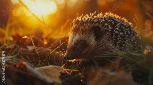 © Sascha, Fototapeta premium Twilight Encounter: Garden Hedgehog Up Close. Generative AI