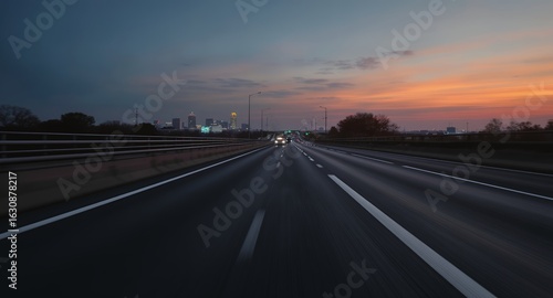 © Patria, Fototapeta premium Twilight Highway View of City Skyline at Dusk