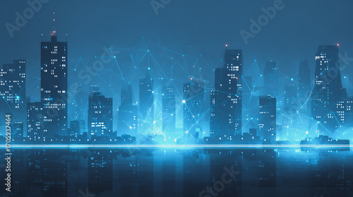 © Teeraphon, Obraz premium Twilight in the Smart digital Innovation city with connection network reciprocity over the cityscape. of future smart wireless digital city and social media networking systems that connects people