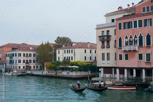 © Hanna, Fototapeta premium Twilight in Venice, Italy. View of the Grand Canal and houses on the shore, people ride boats.