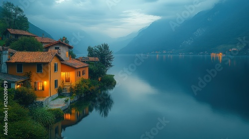 © adiar, Fototapeta premium Twilight Lakeside Village, Italian Alps, Calm Waters, Night