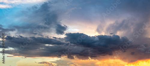 © Rawf8, Naklejka premium Twilight light color the cloudy sky. Cloud on blue sky background. Cloudscape grey and orange shade.