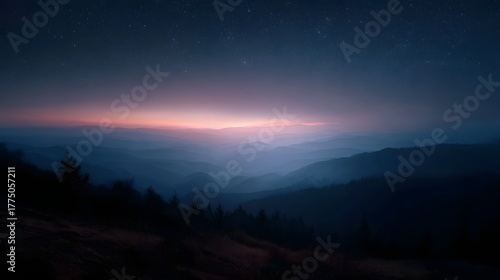 © Thares2020, Naklejka premium Twilight mountain landscape bathed in soft gradient light with a starry night sky overhead and atmospheric mist