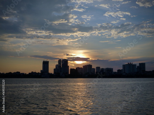 © Thành Đô Nguyễn, Fototapeta premium Twilight Over Waterfront Skyline — Deep Blue Hour Tones, Silver Highlights, Calm Evening