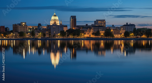 © evening_tao, Fototapeta premium Twilight Serenity by the City Lakefront