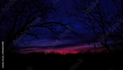 © vxnaghiyev, Fototapeta premium Twilight sky with silhouetted tree branches, serving as a calm backdrop for editorial design during fall