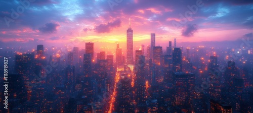 © zong, Fototapeta premium Twilight Skyline of Chicago Modern Architecture Illuminated by Golden Lights