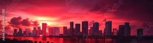 © Keattipoom, Fototapeta premium Twilight Splendor: Hyper-Realistic Ruby-Toned Miami Skyline at Sunset