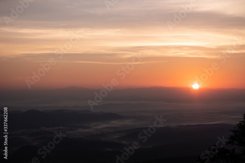 Fototapeta premium Twilight, sunrise and sea of fog in the morning on the mountains of northern Thailand, during the rainy season.