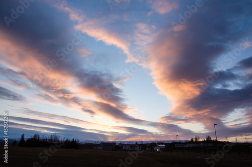 Obraz premium Twilight sunset, colorful cloud, dry land, Iceland