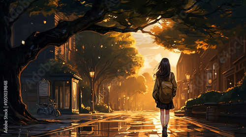 © Joshua riki, Fototapeta premium Twilight Walk: Anime School Adventure