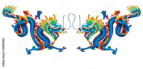 © sattapapan tratong, Obraz premium Twin blue dragon statues on white background with reflection