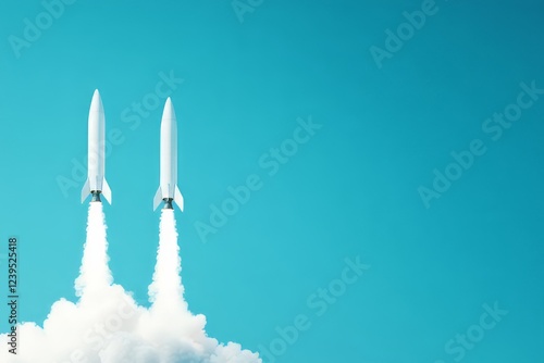 © Space Priest, Fototapeta premium Twin rockets launching against a clear blue sky