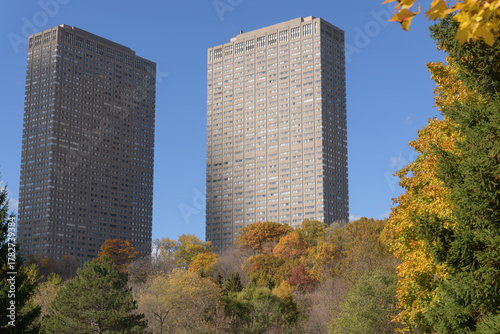 Obraz premium twin towers at 85 and 95 Thorncliffe Park Drive known as Leaside Towers seen from Don Valley Trail, Toronto
