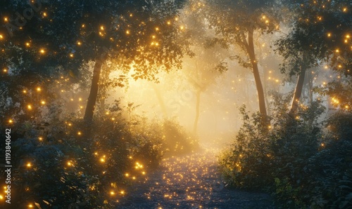 Naklejka premium Twinkling path through misty forest illuminated by soft golden light,...