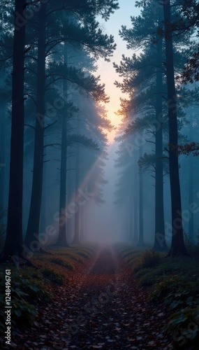 © Prasert, Fototapeta premium Twinkling starlight on a misty forest landscape at dusk, fog, mist, autumn