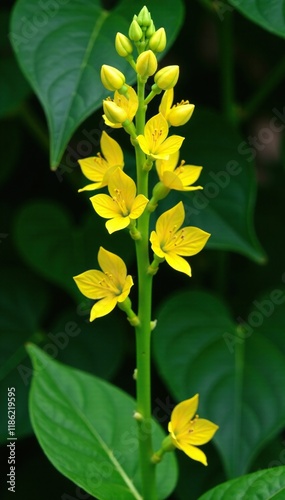 © methinee, Fototapeta premium Twisted stem with yellow flowers and green leaves, wildflower, aristolochia clematitis,
