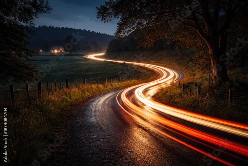 © The 2R Artificiality, Obraz premium Twisting country road illuminated by moving vehicle light trails in rural setting