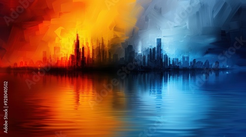 © Kittipong, Obraz premium Two abstract cityscapes in conflict with contrasting colors