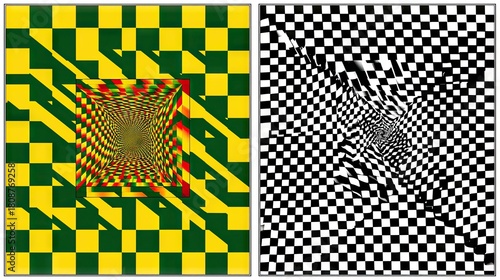 © cavan, Fototapeta premium Two abstract images featuring checkerboard patterns, one in yellow and green with a tunnel effect, and the other in black and white with a swirling distortion.