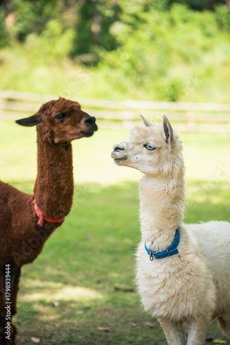 © WMSTUDIO, Naklejka premium Two Adorable Alpacas in a Lush Green Pasture with Bright Sunlight Highlighting Their Unique Features and Playful Interactions in Nature