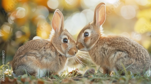 Fototapeta premium Two Adorable Baby Rabbits Nuzzling Each Other in a Sunny Meadow