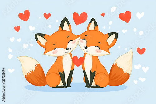 © Noufaldi, Obraz premium Two adorable cartoon foxes sharing a heart in a playful, colorful setting with floating hearts