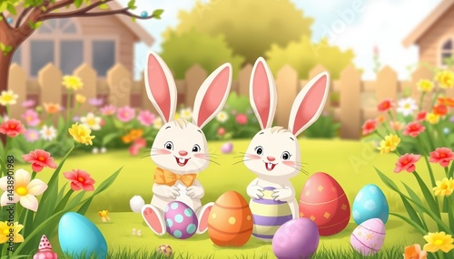 Obraz premium Two Adorable Easter Bunnies Enjoying Springtime in a Colorful Garden with Easter Eggs
