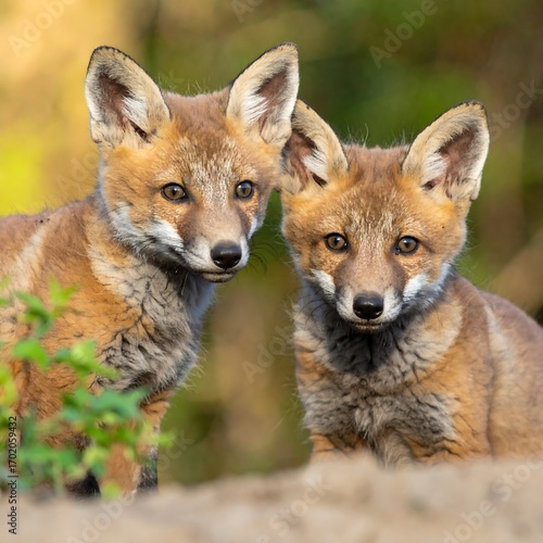 © abror, Obraz premium Two adorable fox kits in a forest