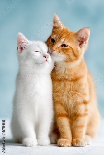 © Andrii, Fototapeta premium Two adorable kittens, white and ginger, cuddling together showing affection and warmth.