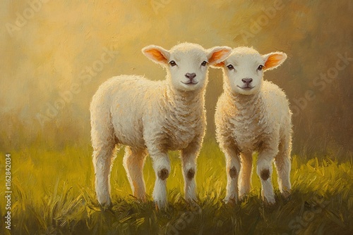 © BerkahStock, Fototapeta premium Two adorable lambs standing in a sunny field.