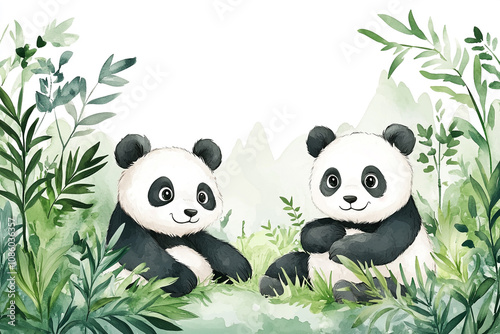 Fototapeta premium Two Adorable Panda Bears Sitting In Lush Greenery