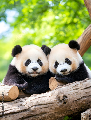 © Supriyono, Fototapeta premium Two adorable panda cubs cuddle on a log, nestled in a lush green forest